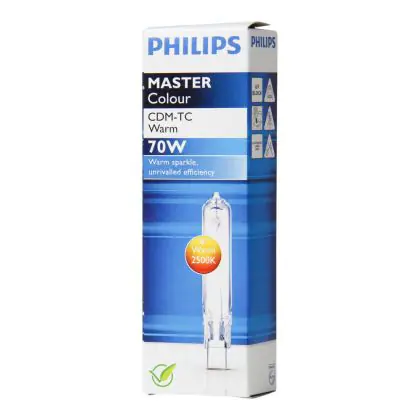 La Philips CDM-TC Warm 70W/925 G8.5 (MASTERColour) é un lampadina a scarica ad attacco G8.5 da 70W dotata di una potenza luminosa sorprendente, 6500 lumen, combinata con una resa dei colori intorno a 90Ra ed una colorazione della luce molto calda, 2600K. La durata complessiva di questa lampadina é di 15.000 ore.