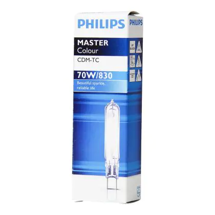 Le Philips MASTERColour CDM-TC 70W/830 G8.5 sono lampade a scarica a ioduri metallici e bruciatore ceramico che assicurano una resa dei colori stabile ed una luce brillante per tutta la vita utile della lampada. Questo modello presenta una base G8.5, forma T14, potenza nominale pari a 70W ed é dotata di uno speciale filtro anti UV che previene lo scolorirsi degli oggetti.
