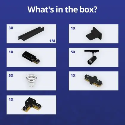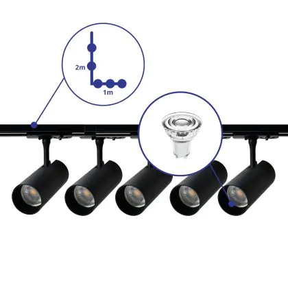 Descrizione Set completo 1-Fase Rail L 1 x 2 Metro Nero | incl. 5x Faretti + GU10 2700K 3W Dimmerabile + Tappo Di Chiusura, Connettore di Alimentazione e L -Connettore
